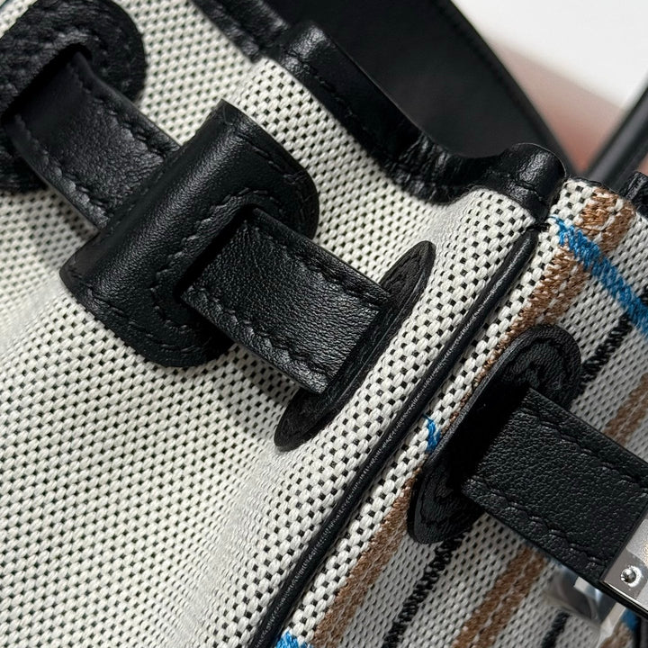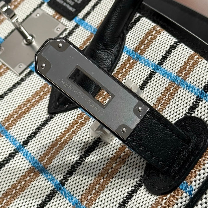 BIRKIN SHOULDER 29 IN BLACK CALFSKIN ÉCRU/NOIR/FAUVE/NOIR/BLEU ZANZIBAR EMBROIDERY PLAID CANVAS