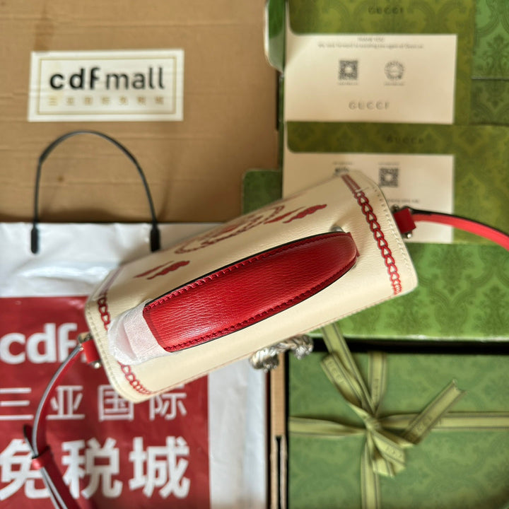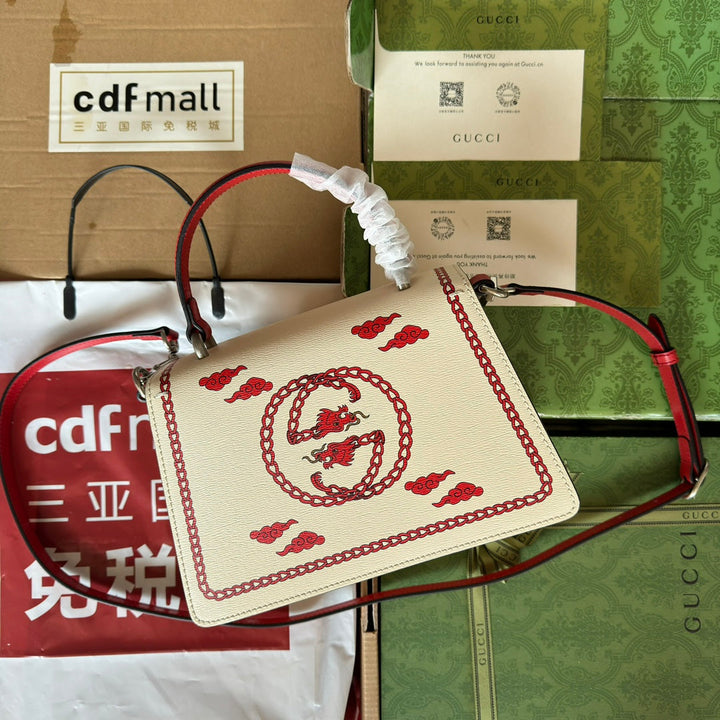 DYONYSUS SMALL TOP HANDLE BAG 24 IN BEIGE MIX RED CALFSKIN DRAGON PRINT